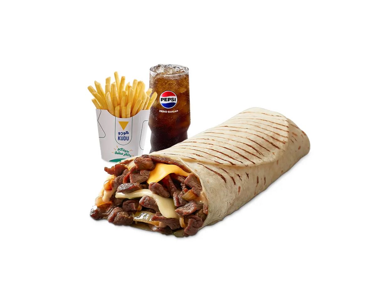 A mix of grilled philly steak comes in tortilla bread with melted yellow cheese,...